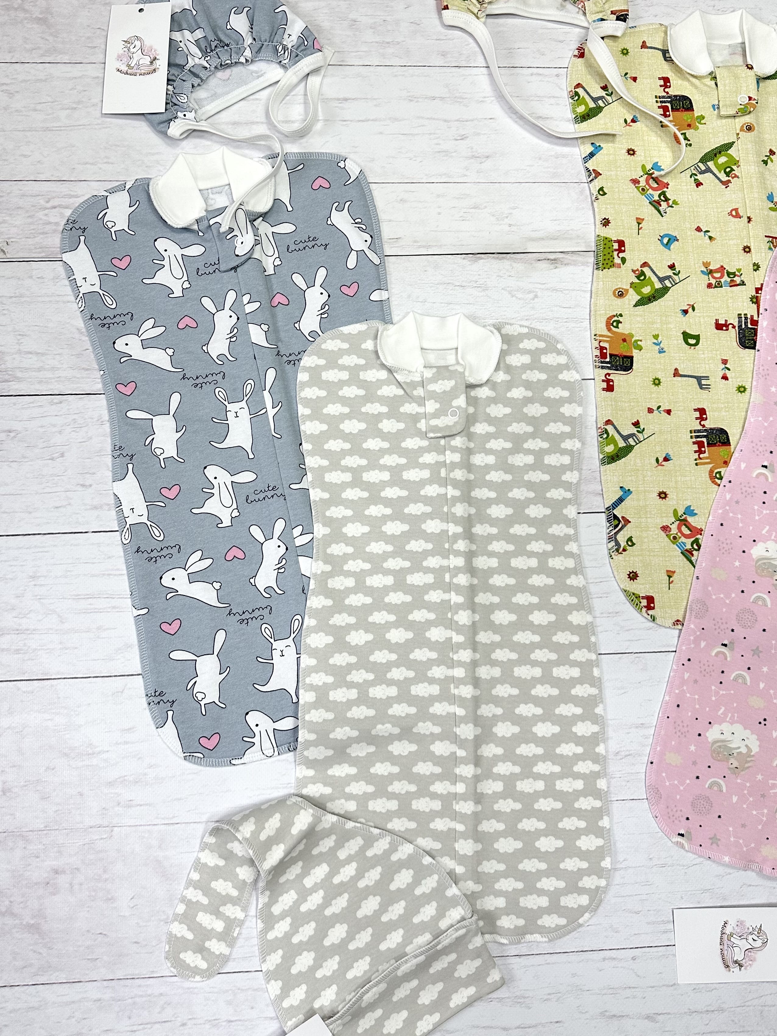 - пеленка-кокон с чепчиком, цвет серый с зайчиками - футер 2-х нитка начес, 100% хлопок