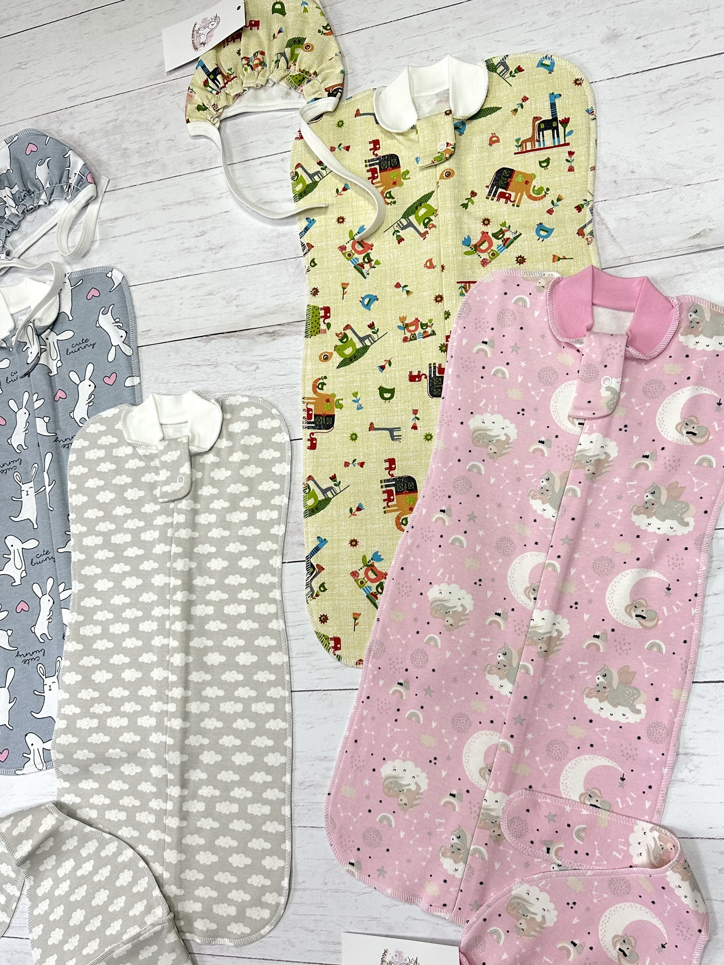 - пеленка-кокон с шапкой, цвет серый с облаками - интерлок, 100% хлопок;