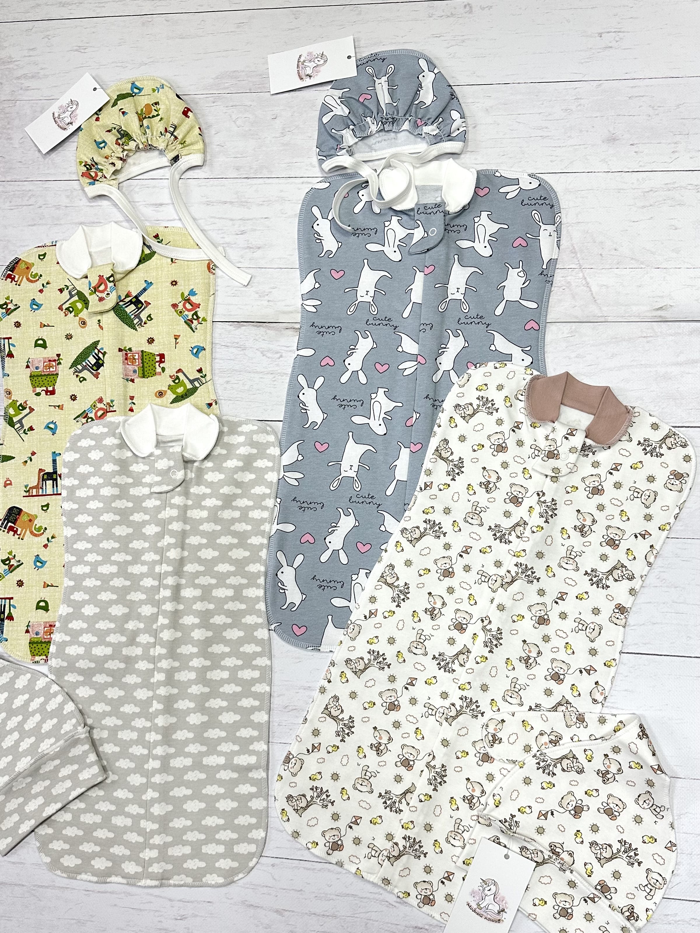 - пеленка-кокон с шапкой, цвет серый с облаками - интерлок, 100% хлопок;