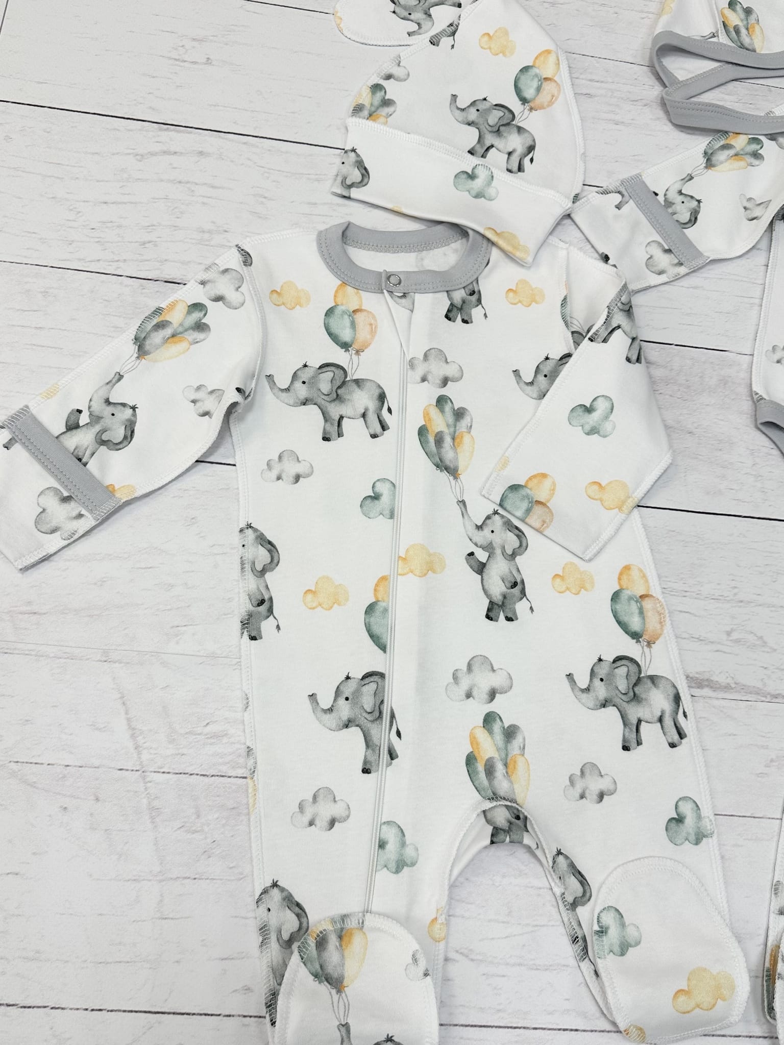 Комплект для новорожденного состоит из 5-ти предметов - комбинезон (слип), боди, ползунки, шапка, чепчик. Это базовая одежда малышей.
