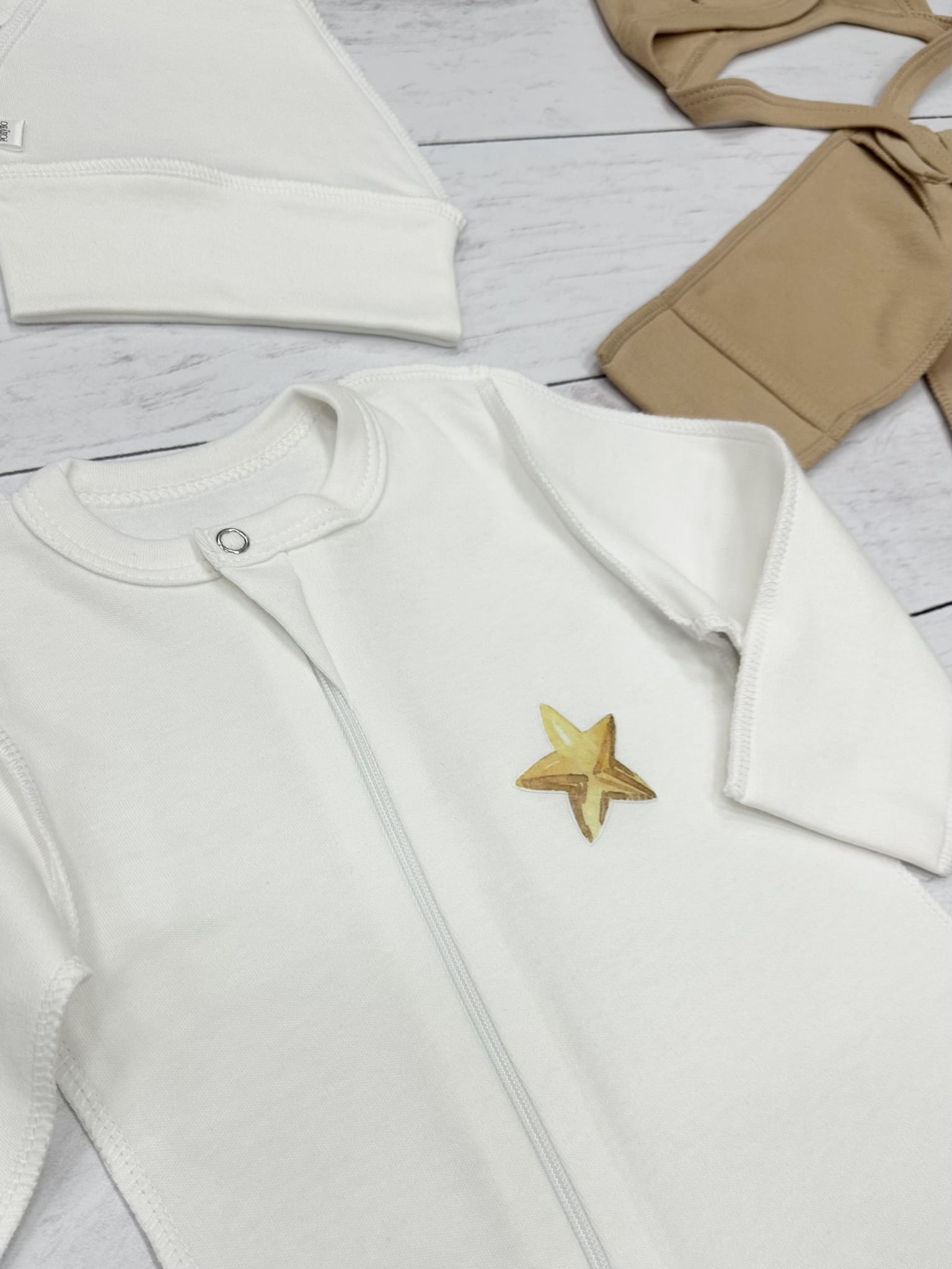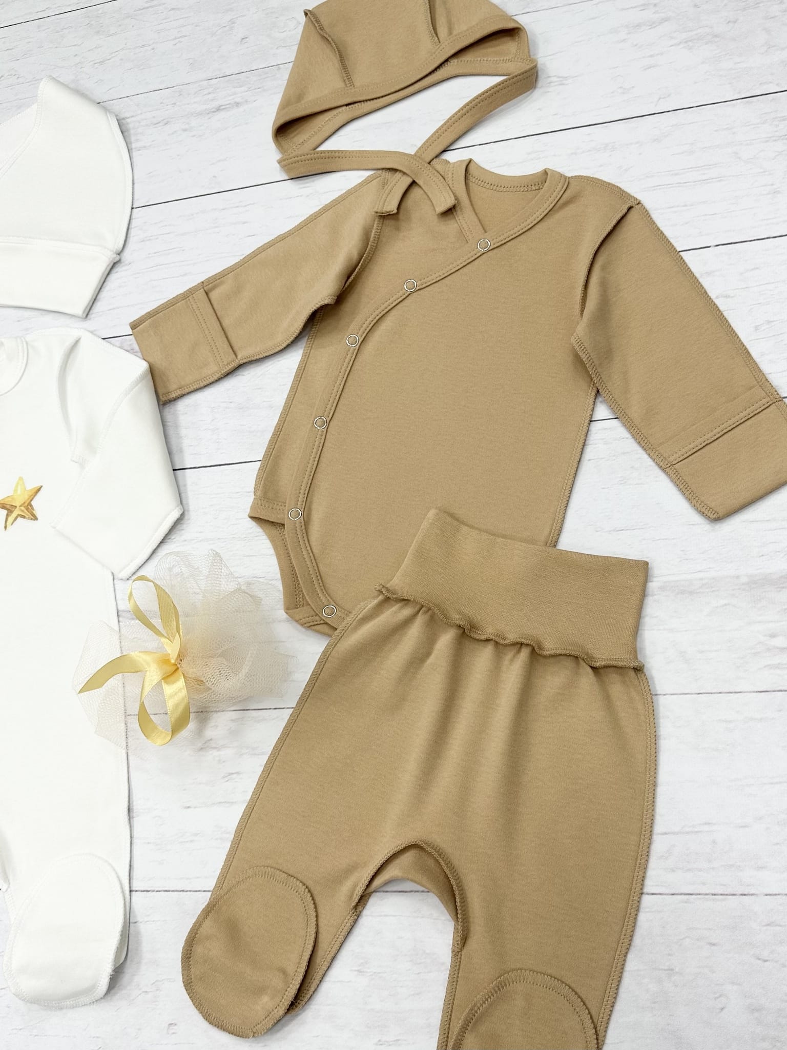 Комплект для новорожденного состоит из 5-ти предметов - комбинезон (слип), боди, ползунки, шапка, чепчик. Это базовая одежда малышей.