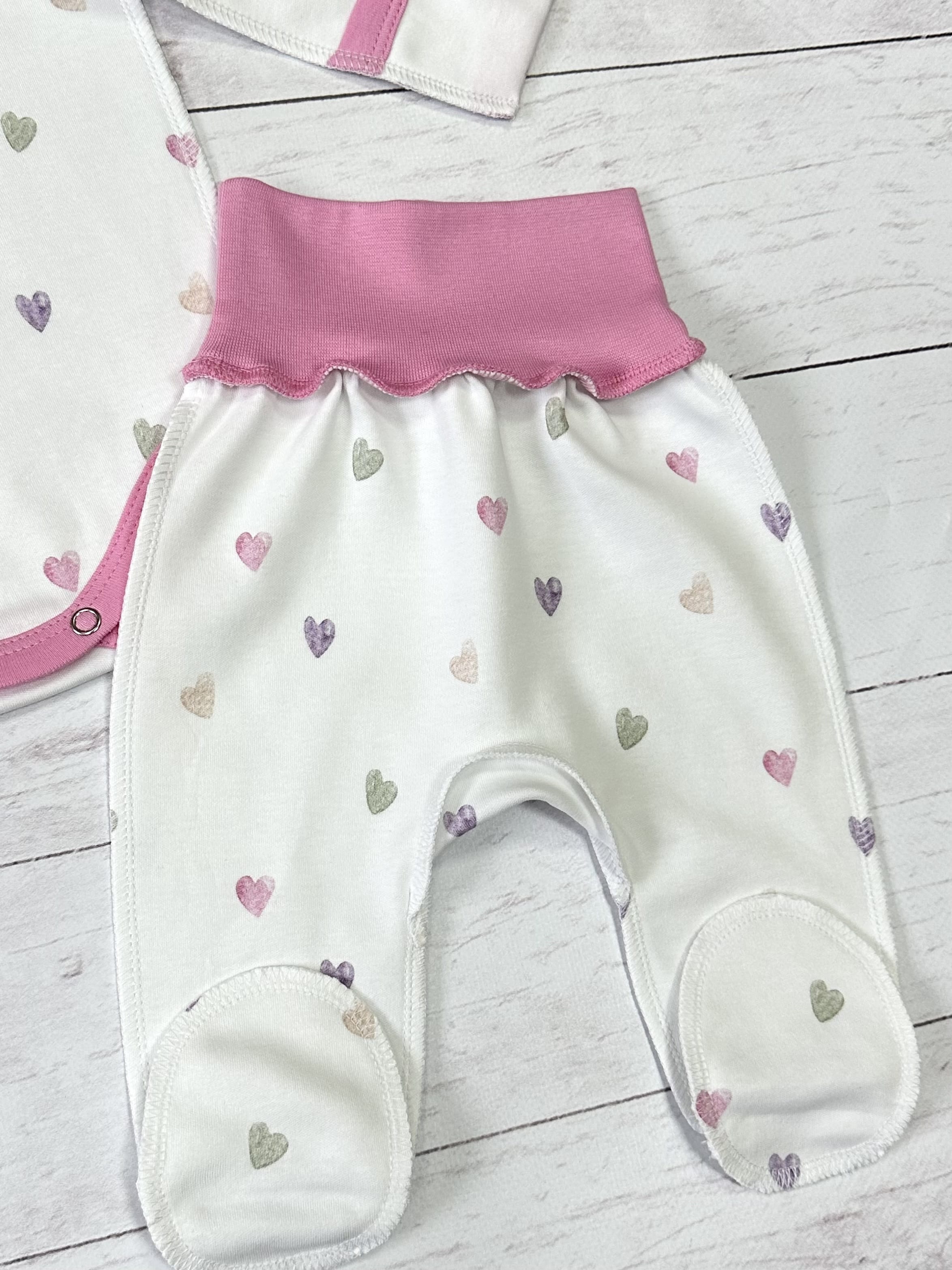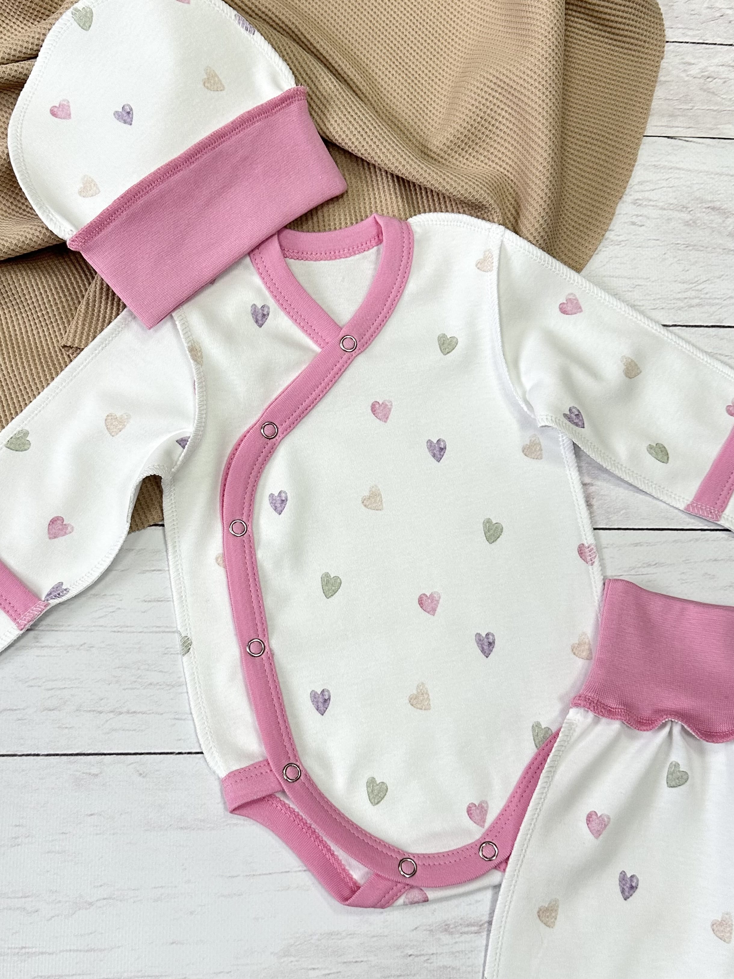 Комплект для новорожденного состоит из 3-х предметов - бодик, ползунки, шапка. Это базовая одежда малышей.