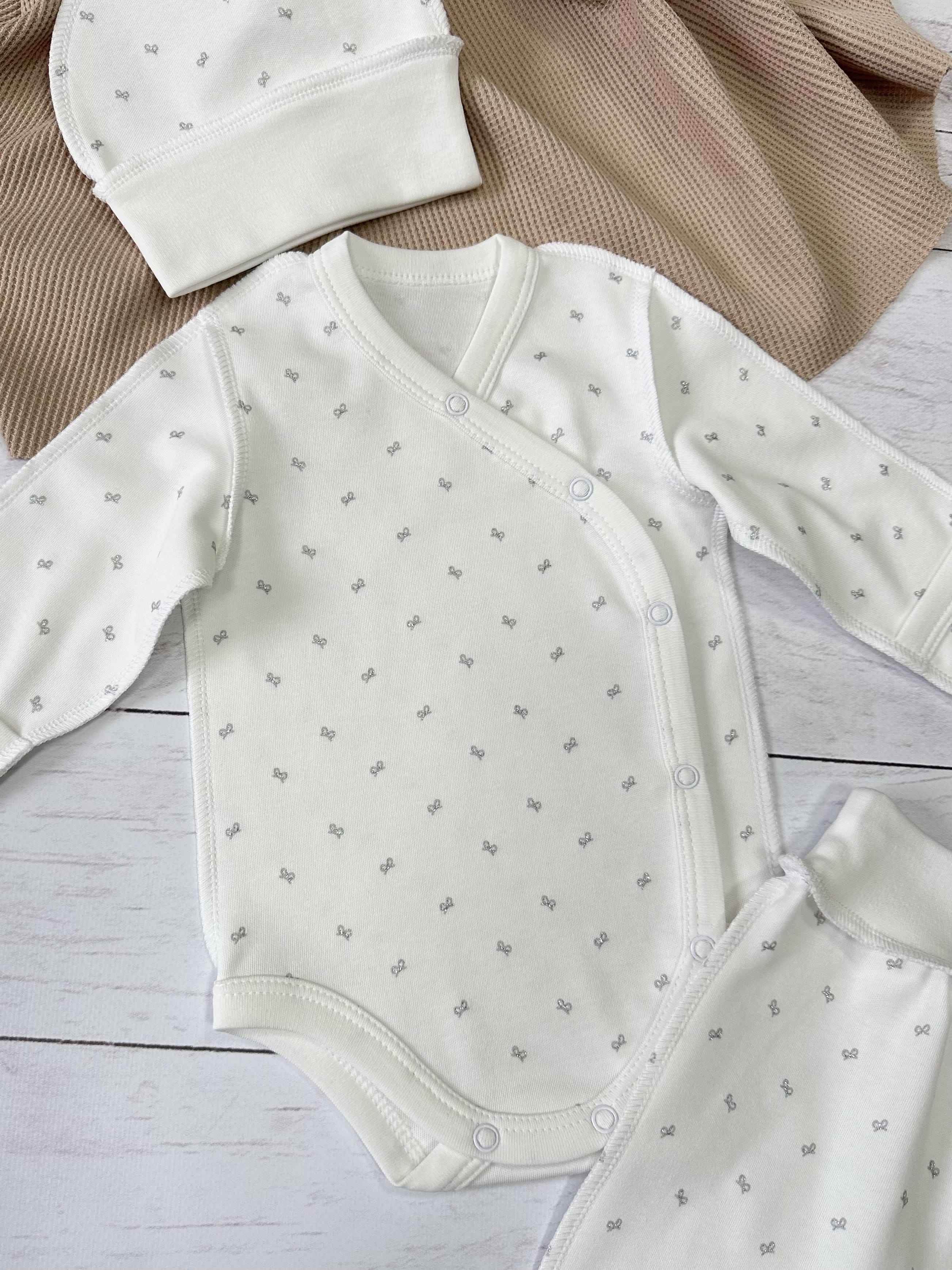 Комплект для новорожденного состоит из 3-х предметов - бодик, ползунки, шапка. Это базовая одежда малышей.