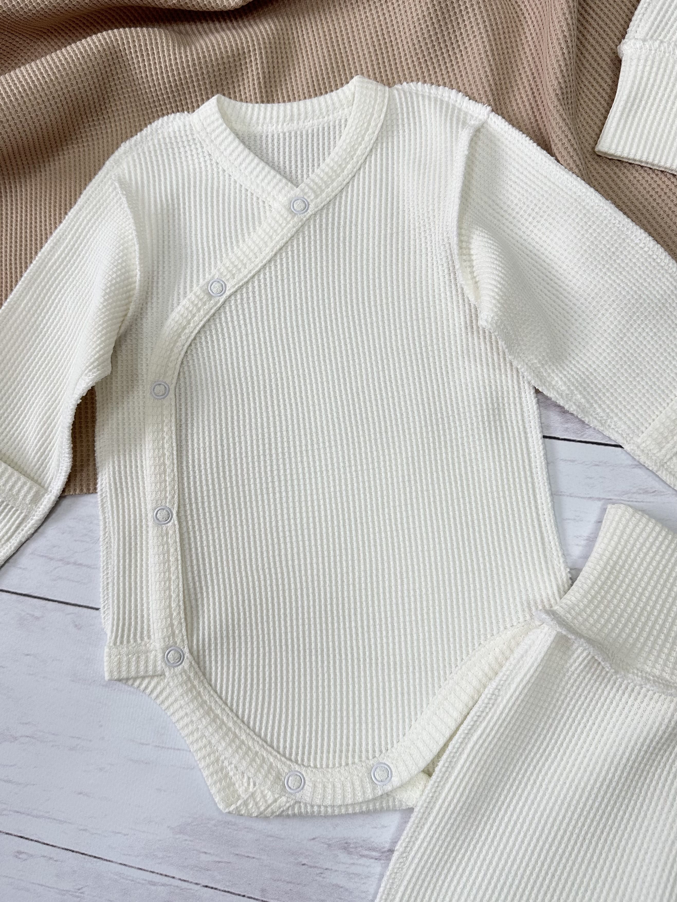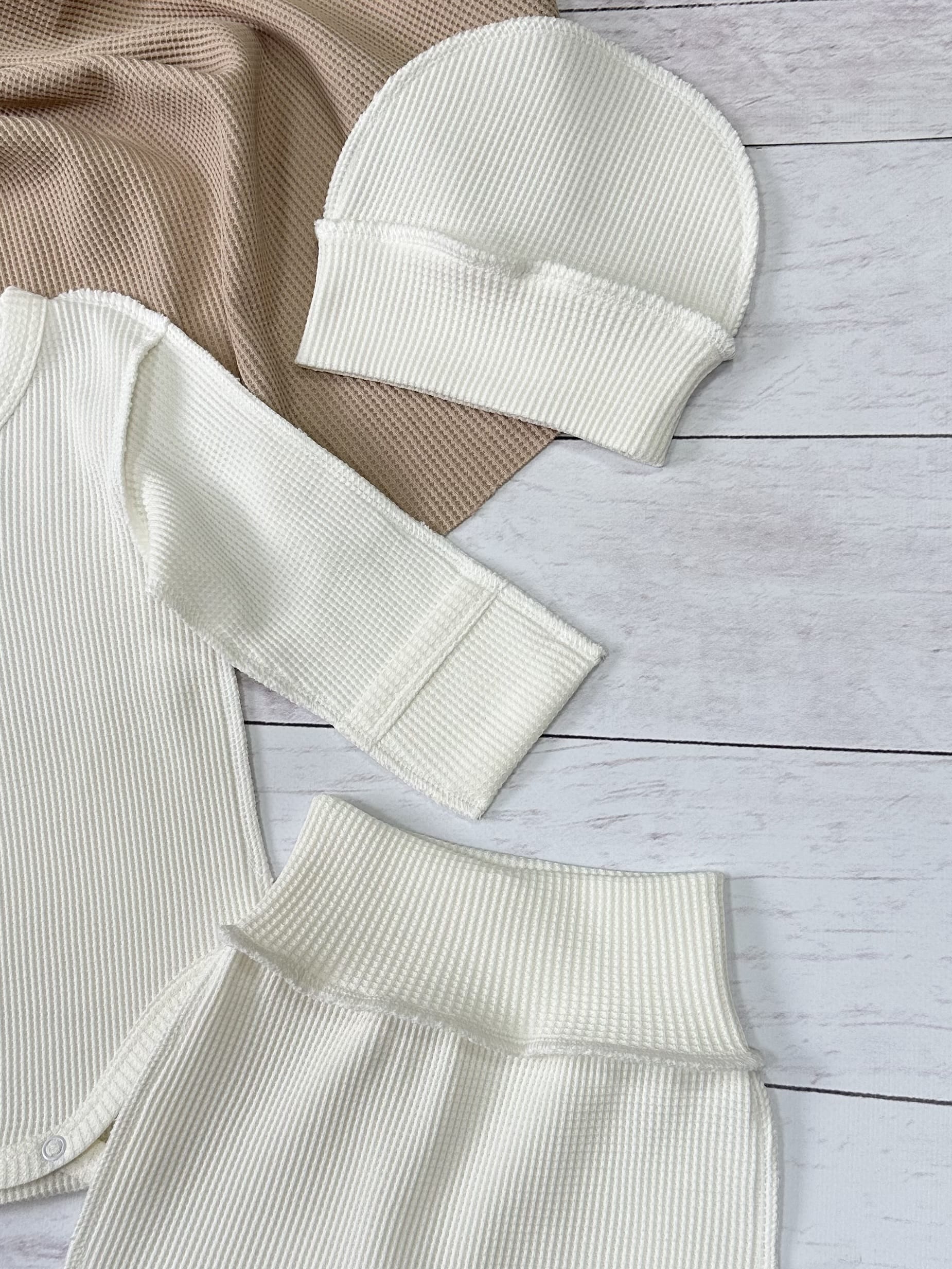 Комплект для новорожденного состоит из 3-х предметов - бодик, ползунки, шапка. Это базовая одежда малышей.