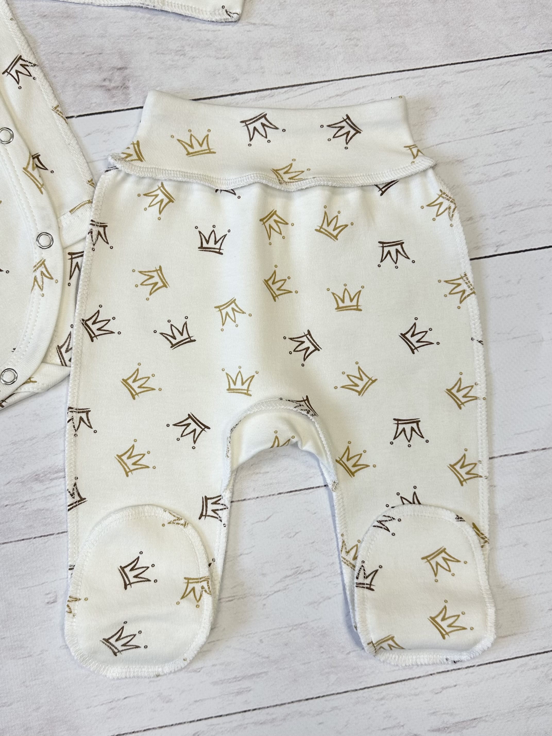 Комплект для новорожденного состоит из 3-х предметов - бодик, ползунки, чепчик. Это базовая одежда малышей.