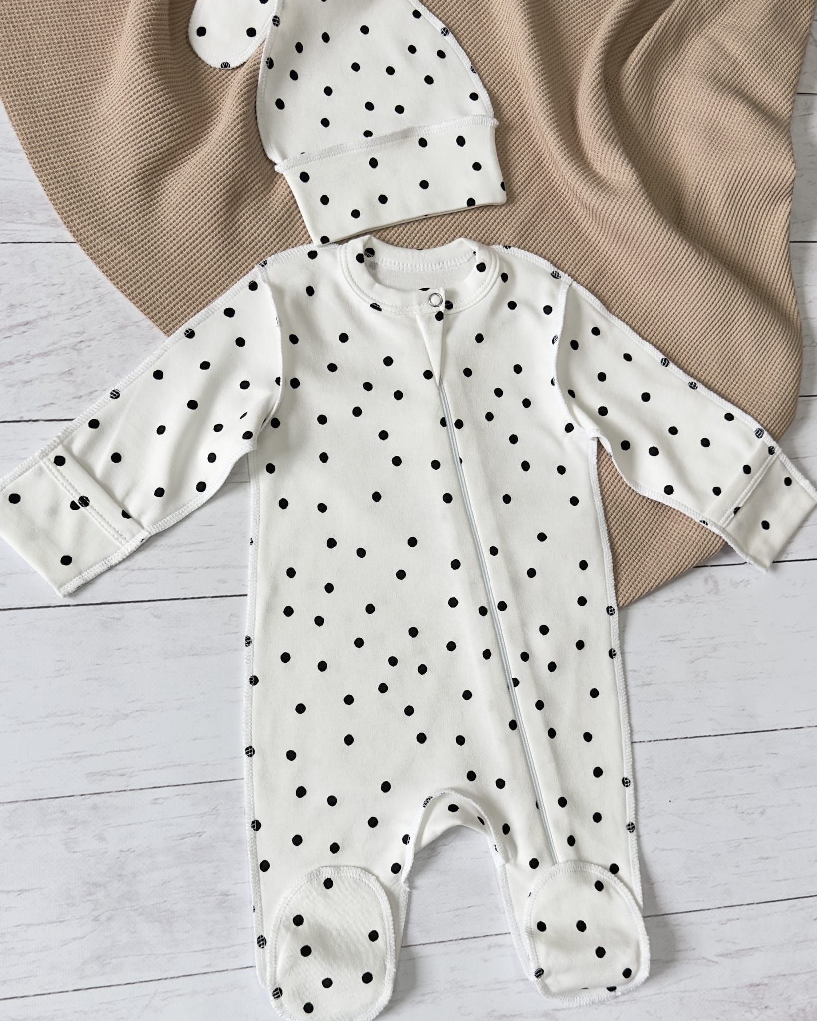 Слип с шапкой отлично подойдет на выписку из роддома.