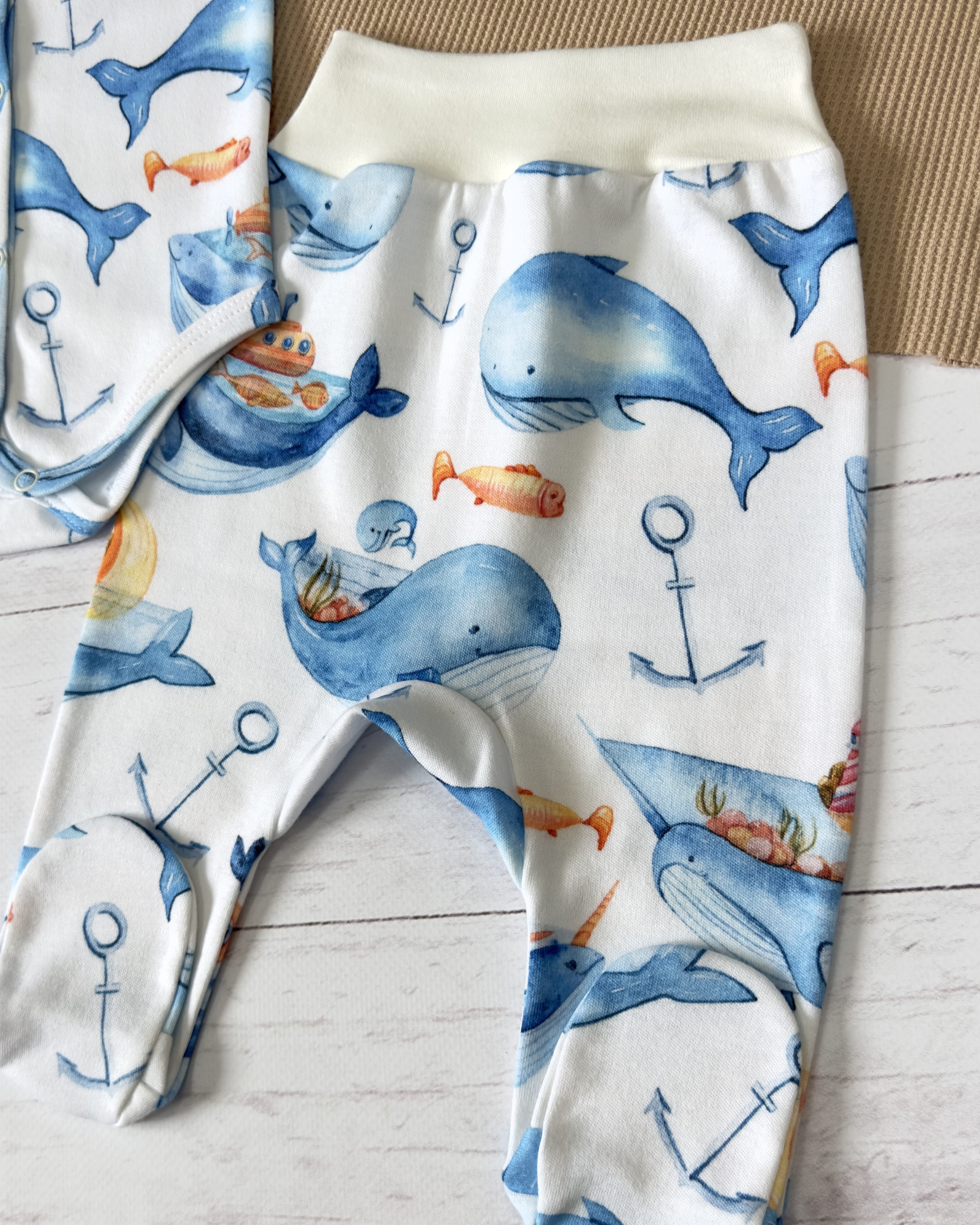 Комплект для малыша состоит из полукомбинезона короткого (боди) и ползунков.