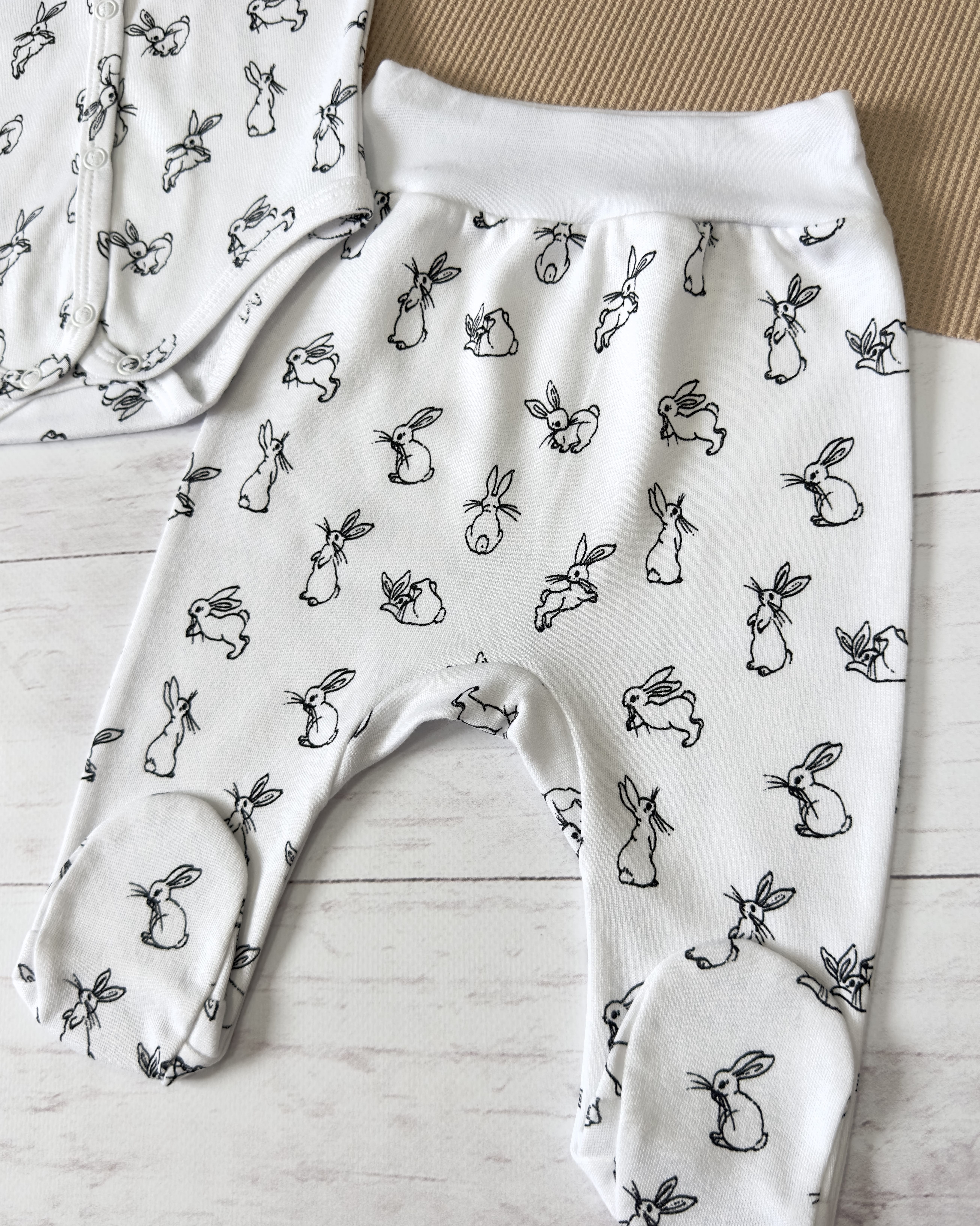Выполнен из мягкого трикотажного полотна интерлок пенье (100% хлопок). Полотно немного тянется, поэтому обеспечивает максимальный комфорт малышу.