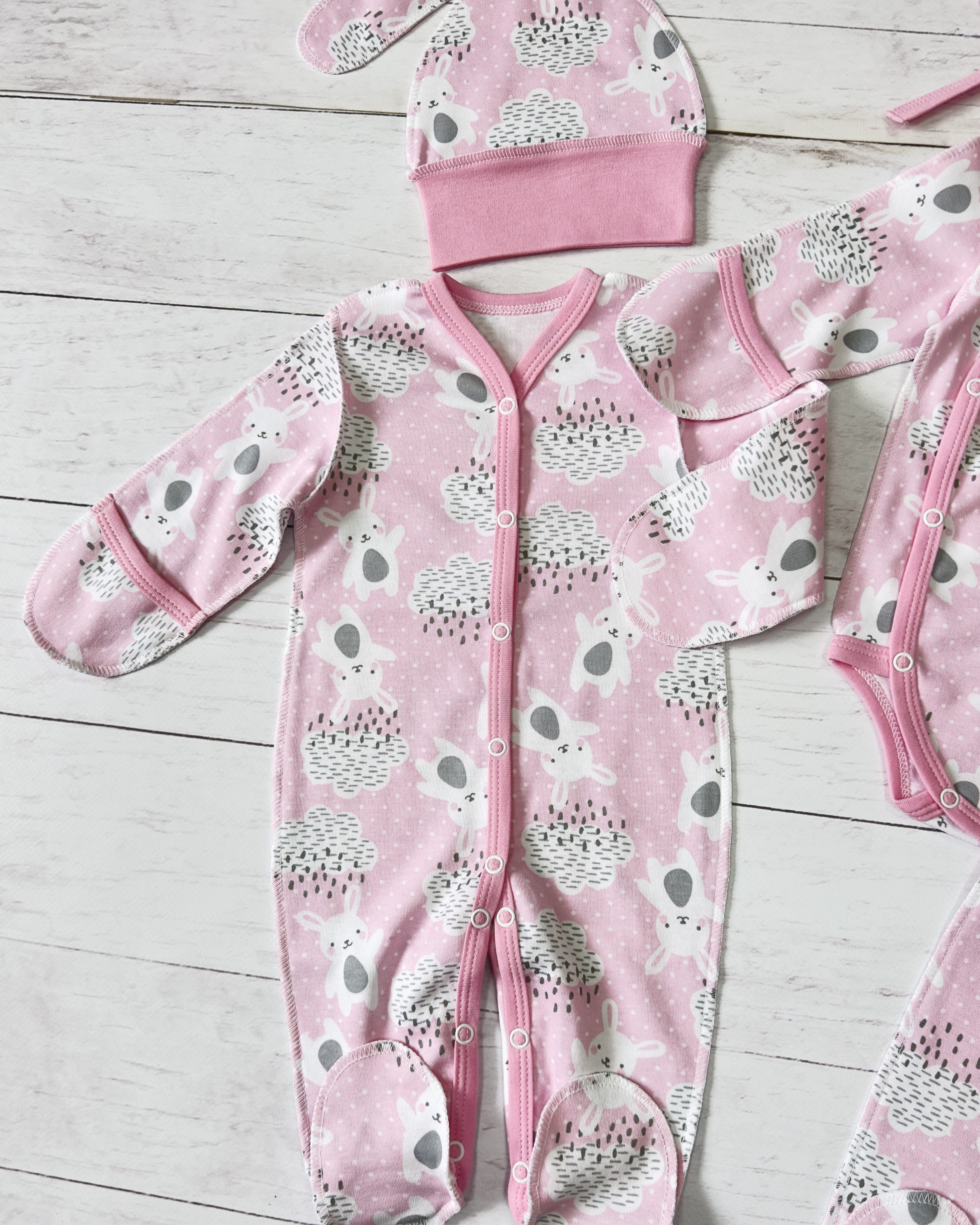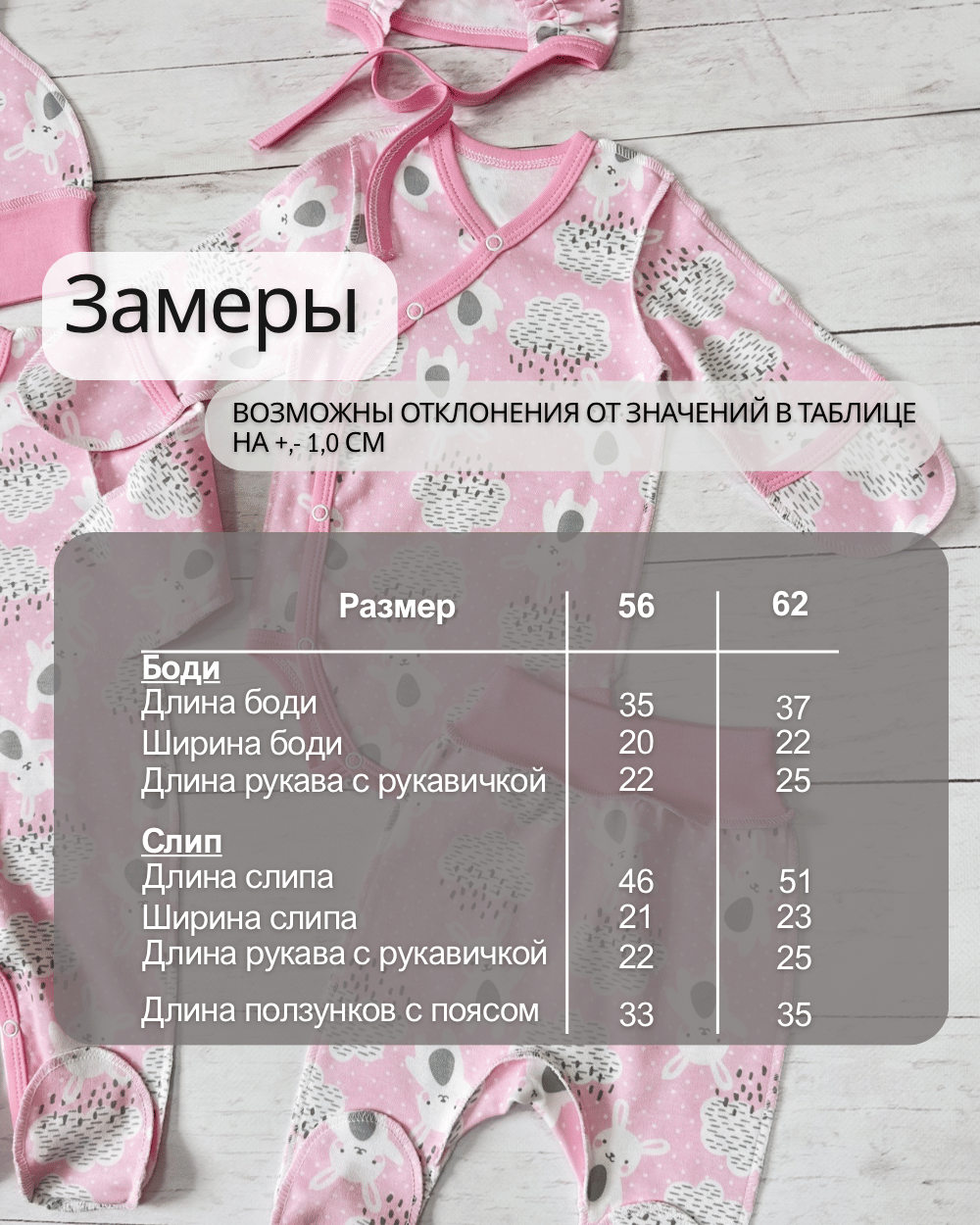 Комплект для новорожденного состоит из 5-ти предметов - комбинезон (слип), боди, ползунки, шапка, чепчик. Это базовая одежда малышей.
