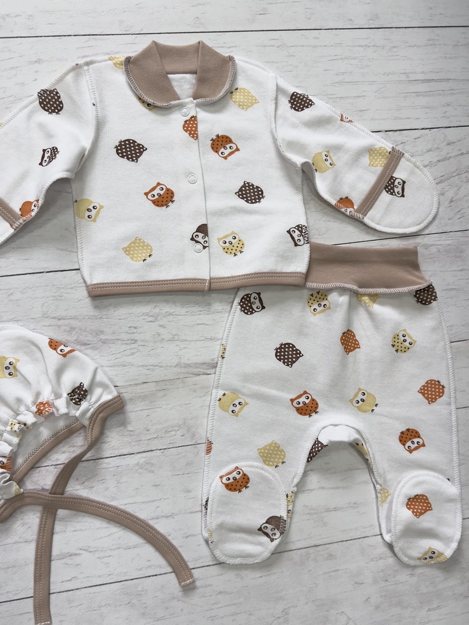 Комплект для новорожденного состоит из 3-х предметов - кофточка, ползунки, чепчик. Это базовая одежда малышей.