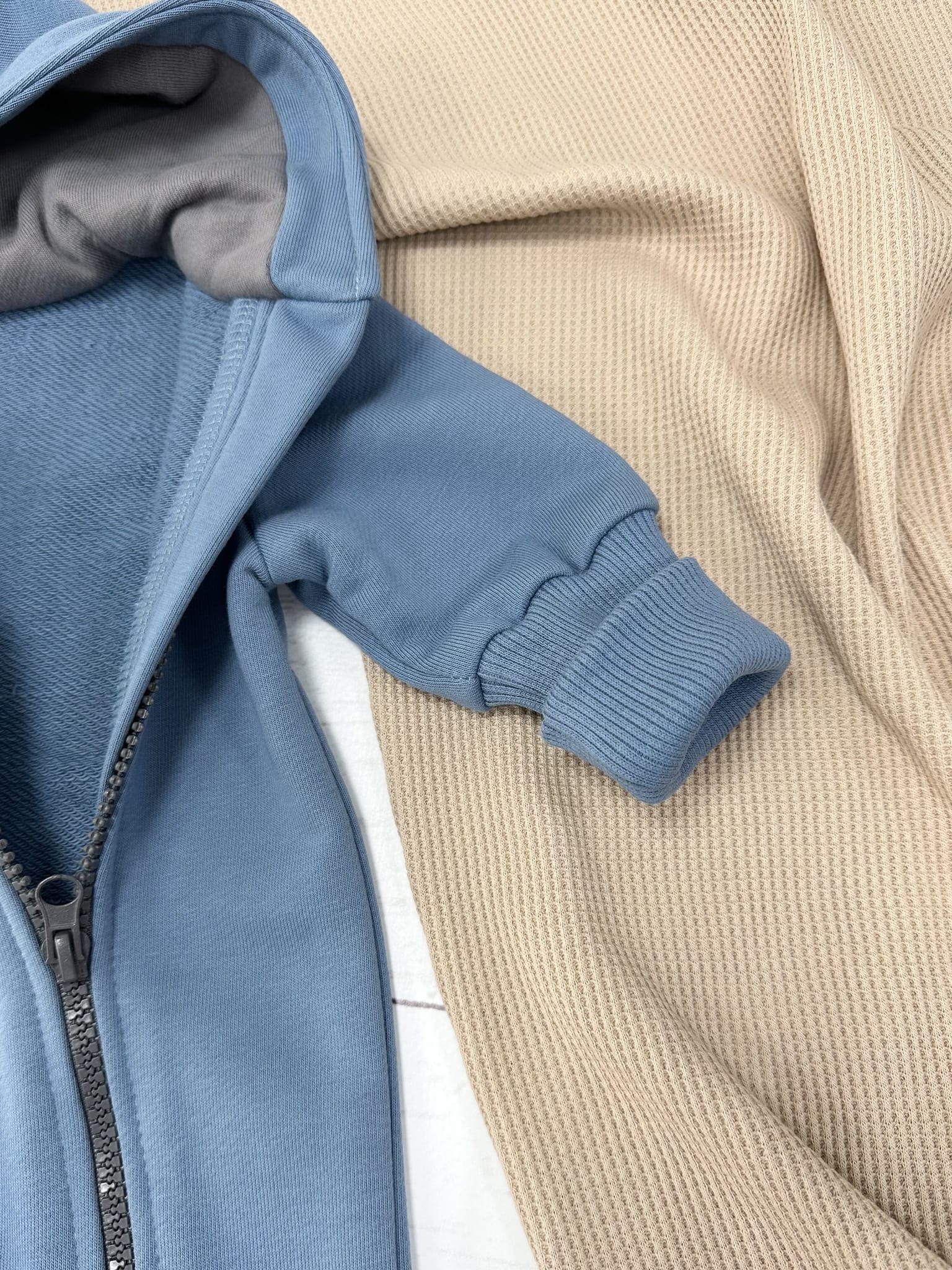 Комбинезон с капюшоном выполнен из качественного футера 3-х нитки петли, что обеспечивает тепло и комфорт малышу.