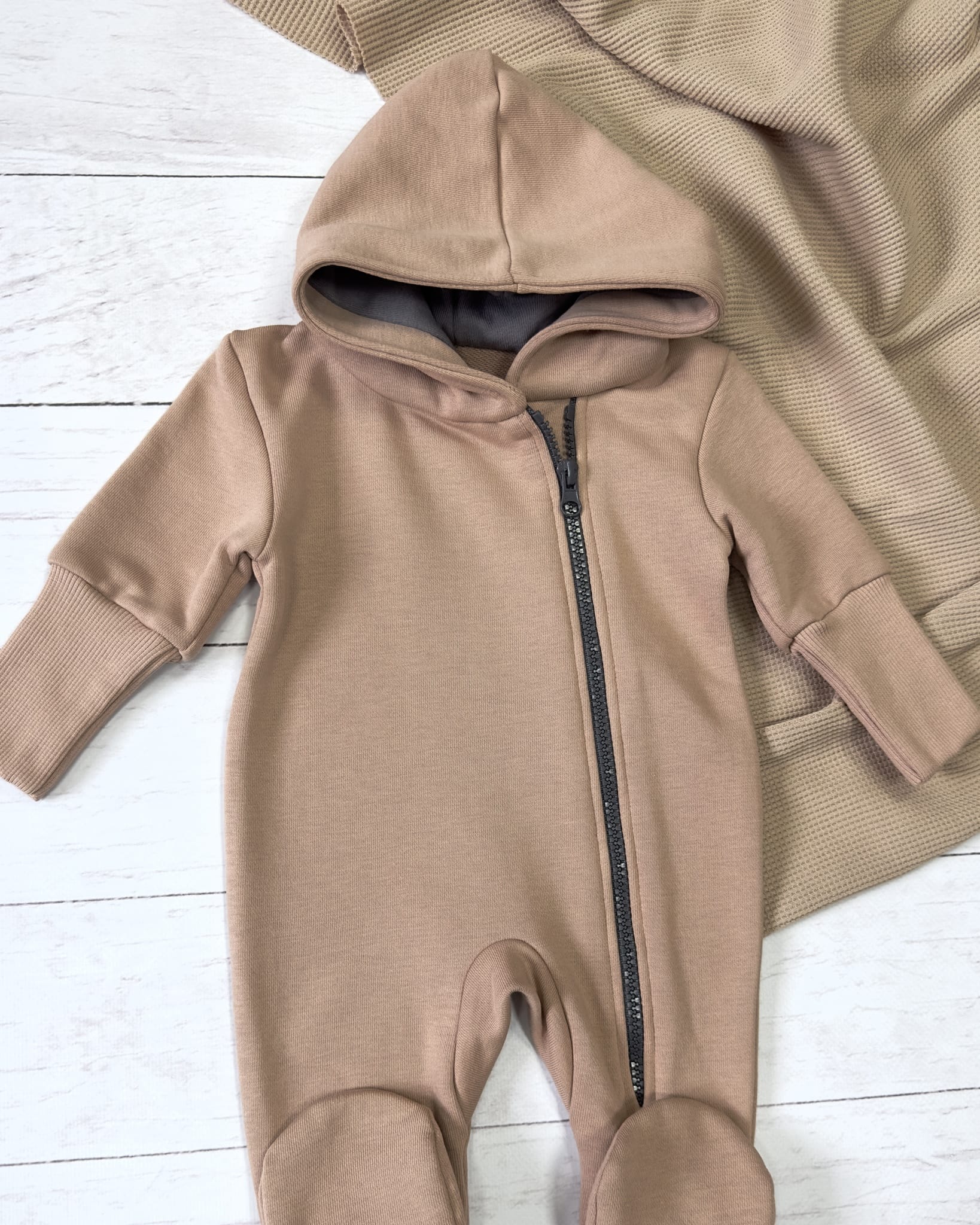 Комбинезон с капюшоном выполнен из качественного футера 3-х нитки петли, что обеспечивает тепло и комфорт малышу.