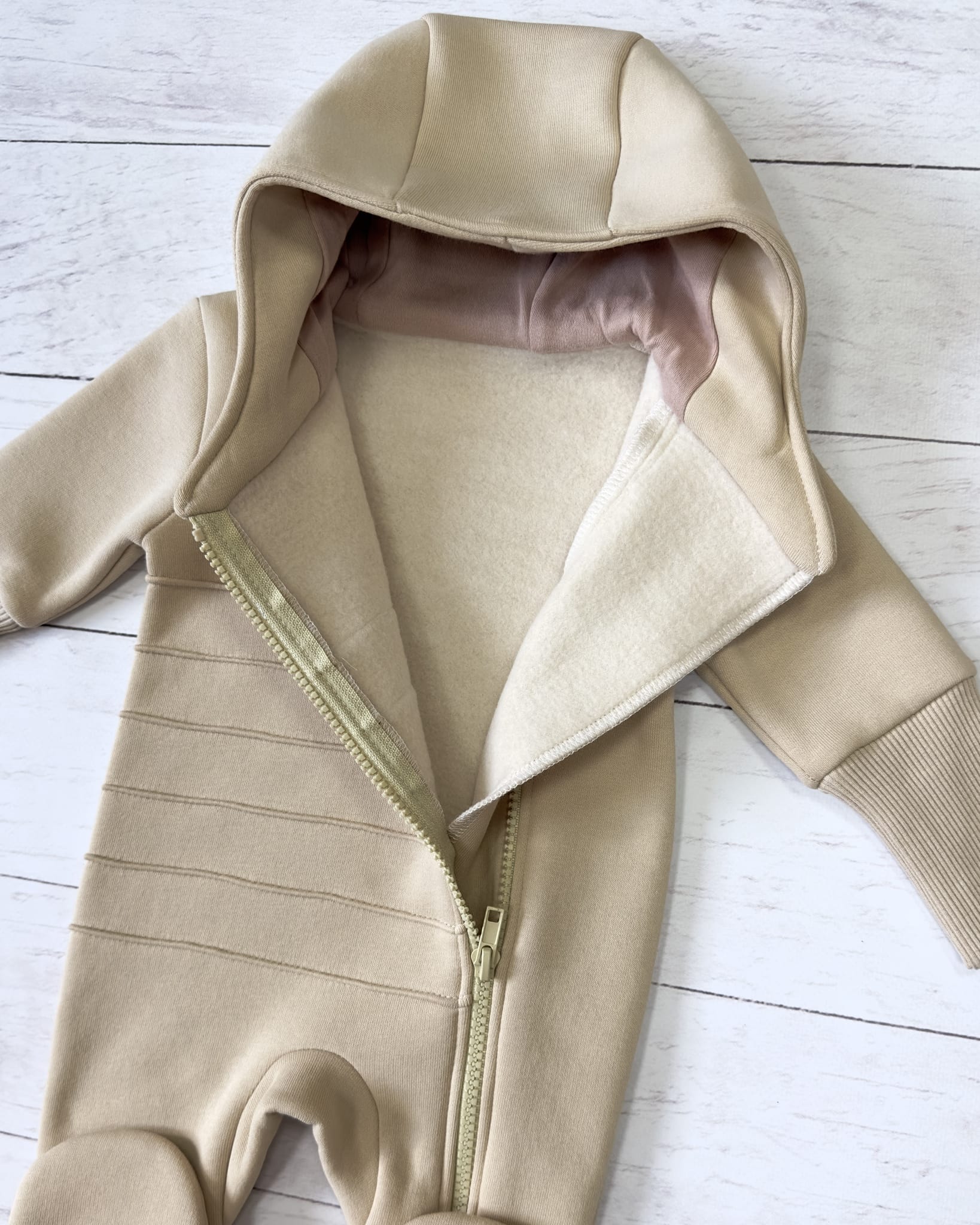 Универсальная модель комбинезона с закрытыми ножками с капюшоном. Сшит из футера 3-х нитки с начесом. Молния расположена максимально удобно, чтобы не защемить шею и подбородок малыша.