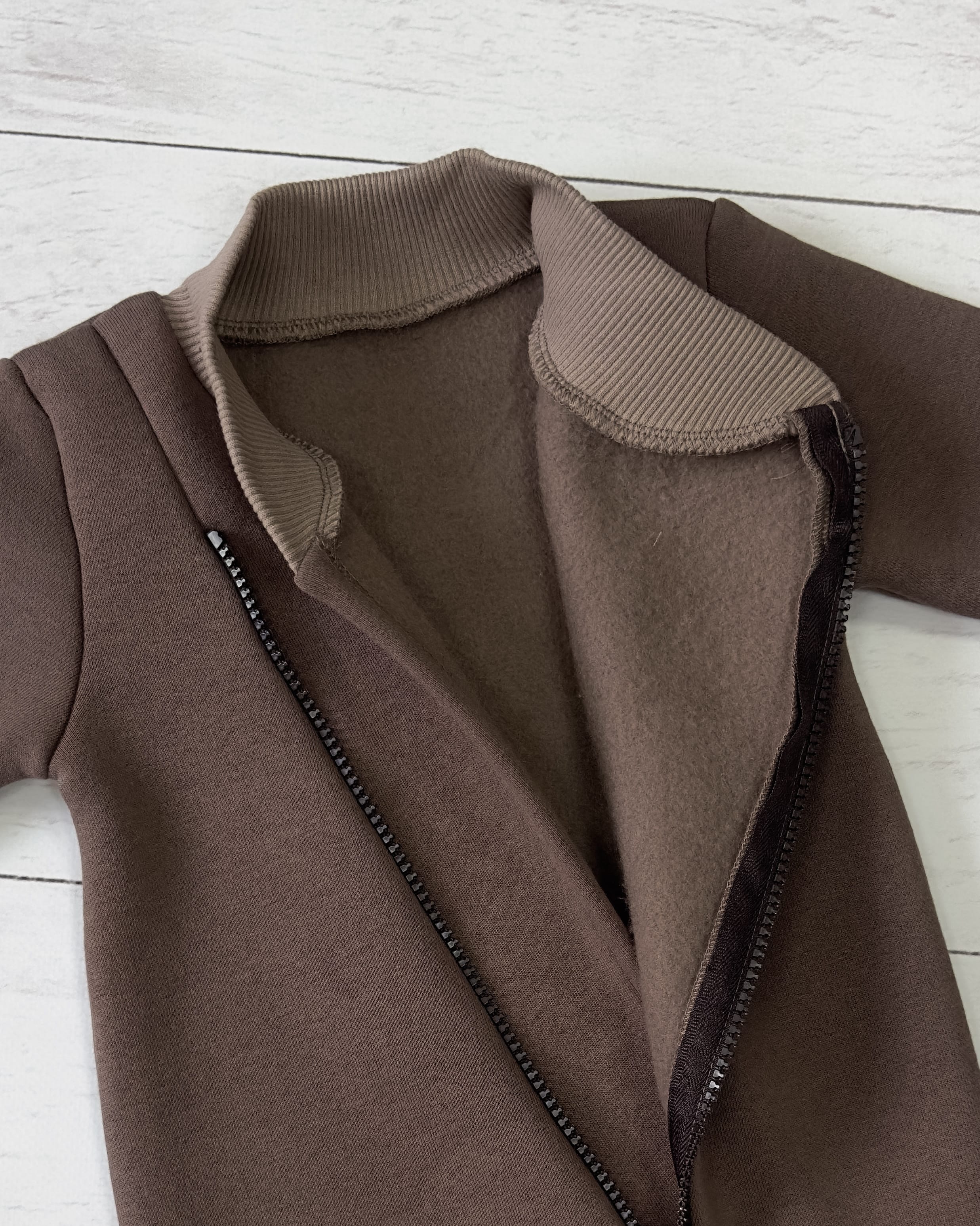Универсальная модель комбинезона с закрытыми ножками без капюшона. Сшит из футера 3-х нитки с начесом. Молния расположена максимально удобно, чтобы не защемить шею и подбородок малыша.