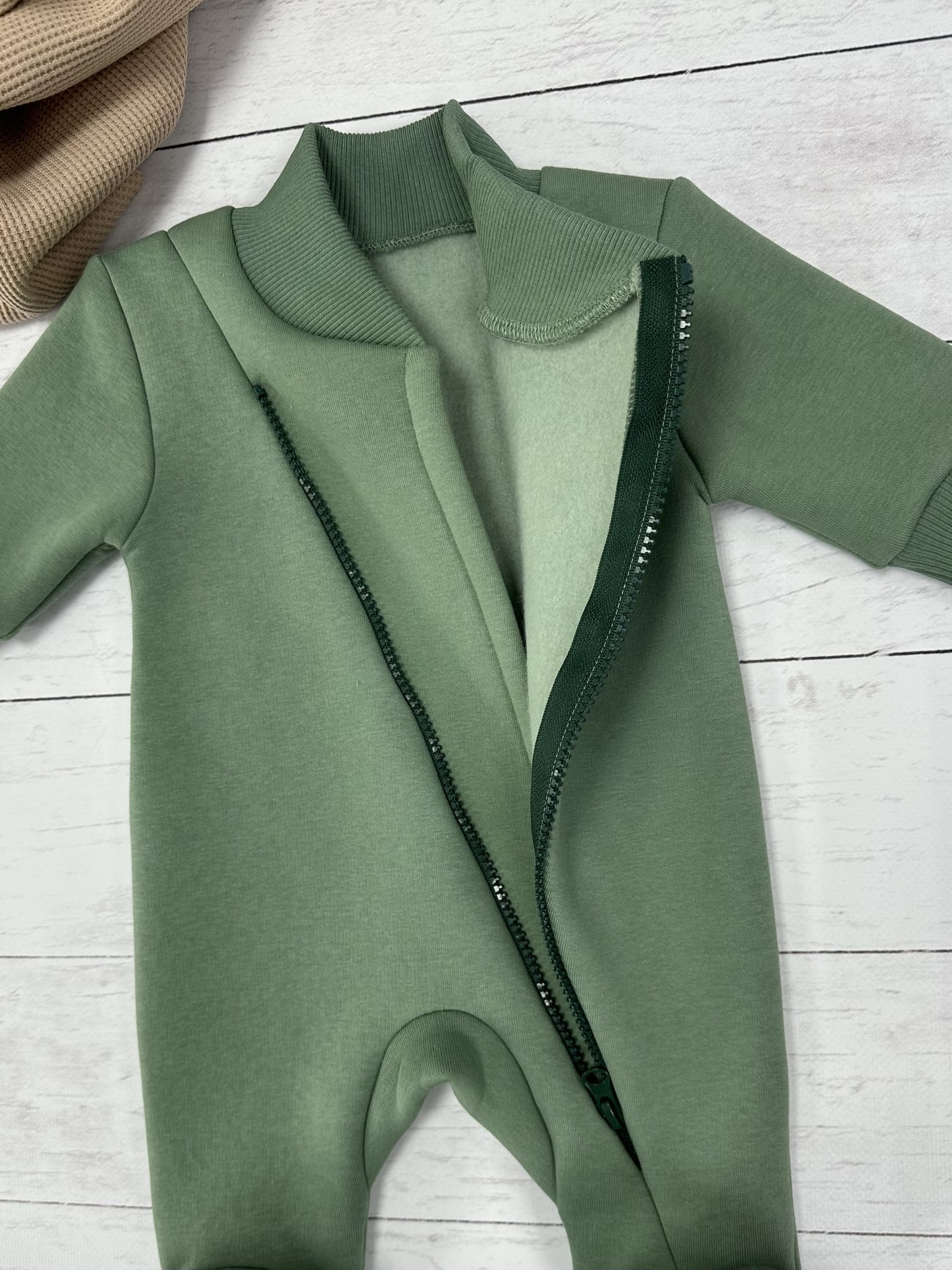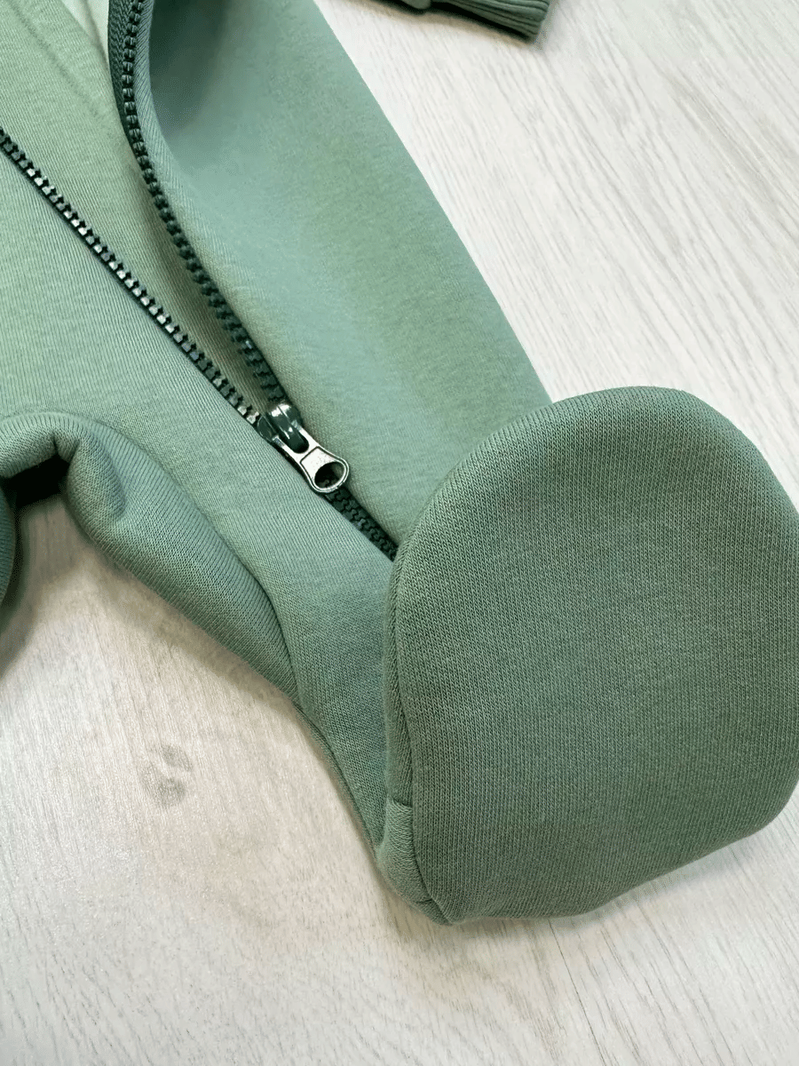 Универсальная модель комбинезона с закрытыми ножками без капюшона. Сшит из футера 3-х нитки с начесом. Молния расположена максимально удобно, чтобы не защемить шею и подбородок малыша.