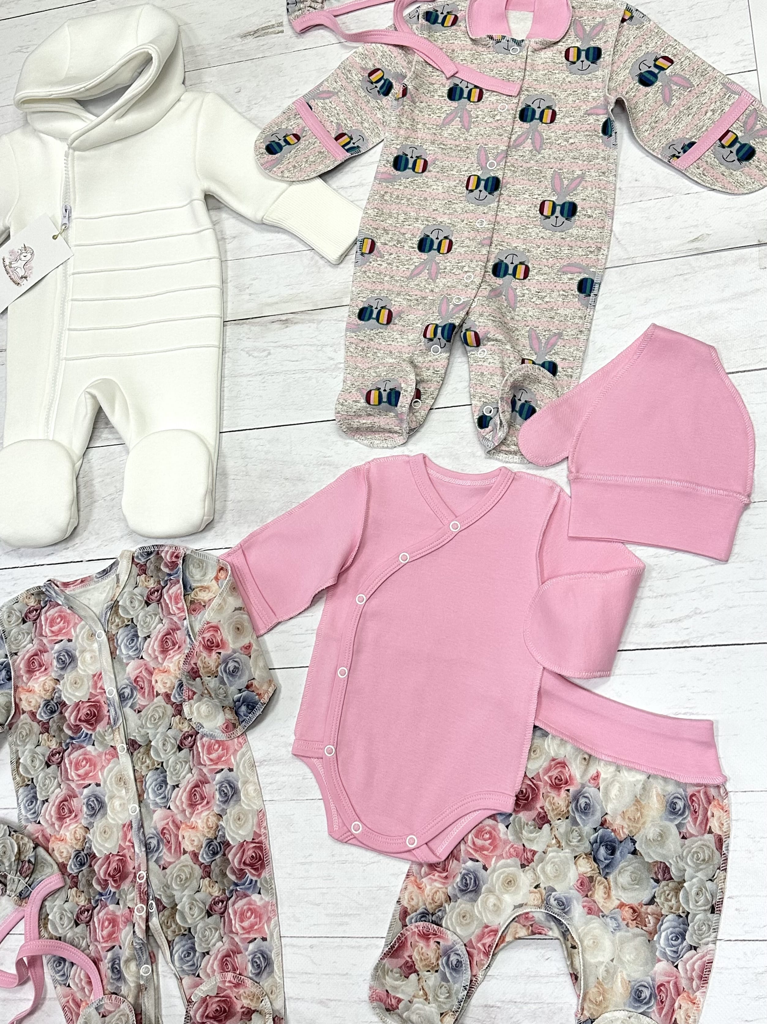 2. комплект 5 пр. (слип, боди, ползунки, чепчик, шапка), цвет розовый с розами - интерлок, 100% хлопок;