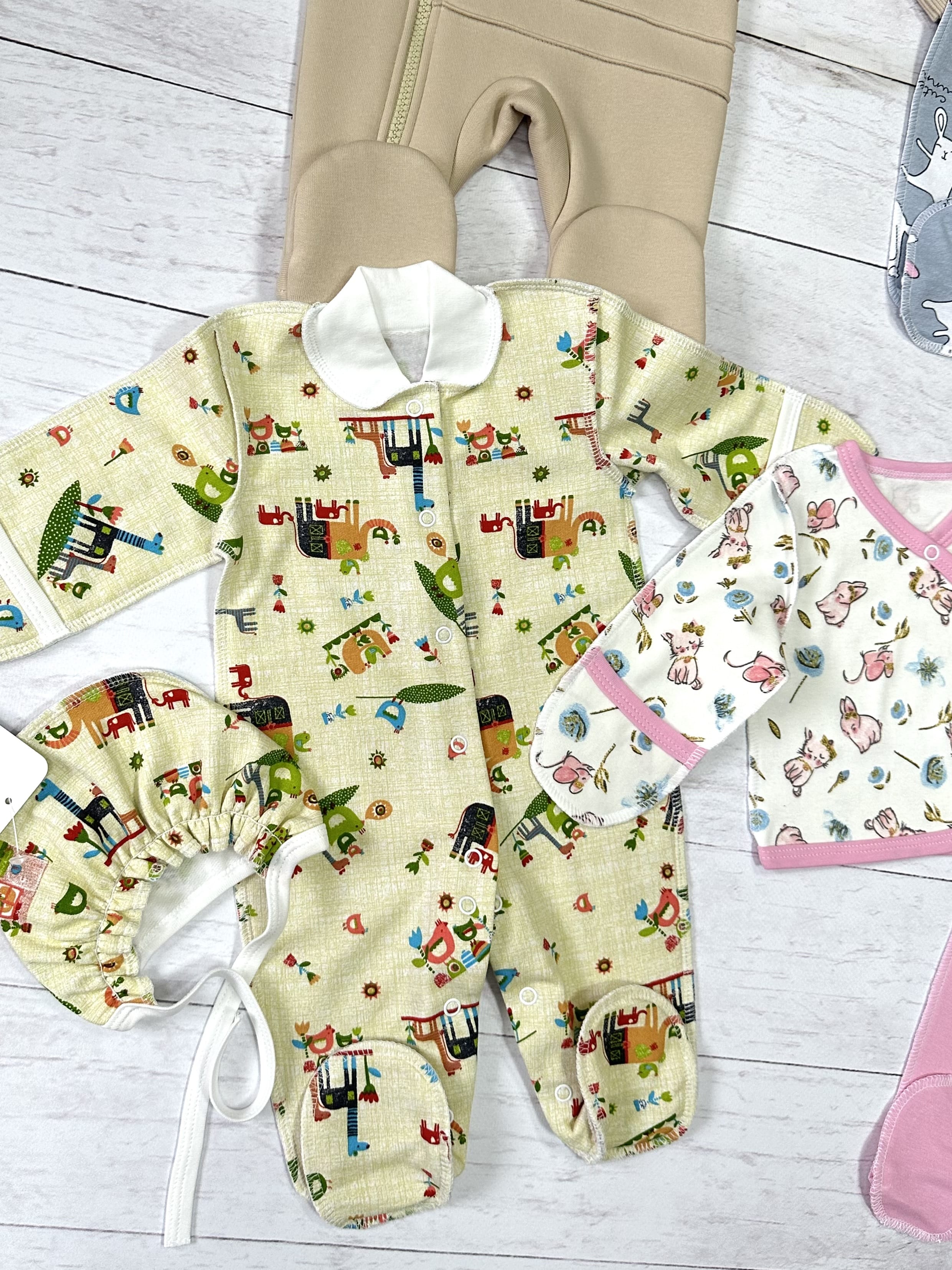 4. слип с чепчиком, цвет желтый с рисунком - футер 2-х нитка с начесом, 100% хлопок.