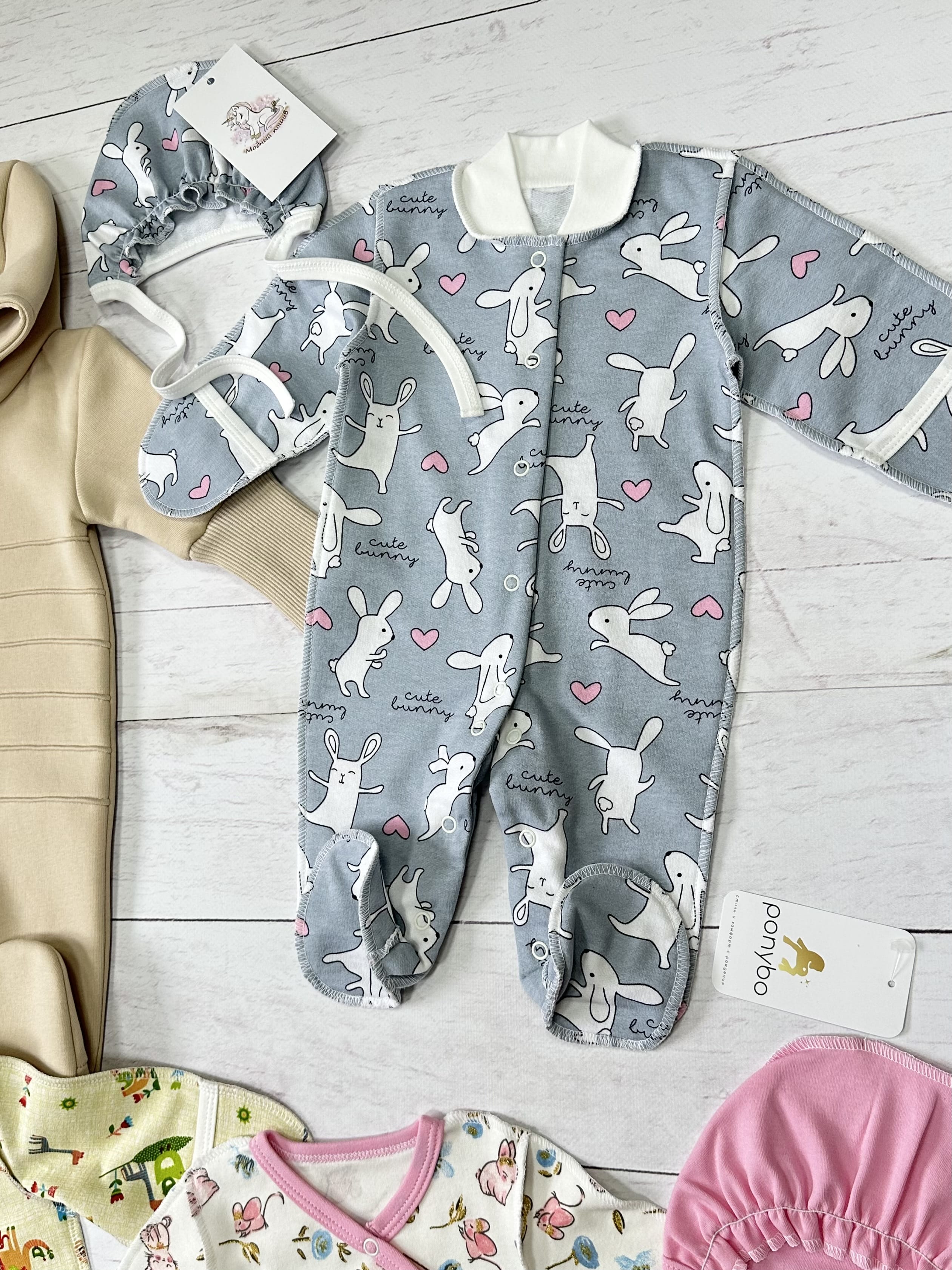 3. слип с чепчиком, цвет серый с зайчиками - футер 2-х нитка с начесом, 100% хлопок;