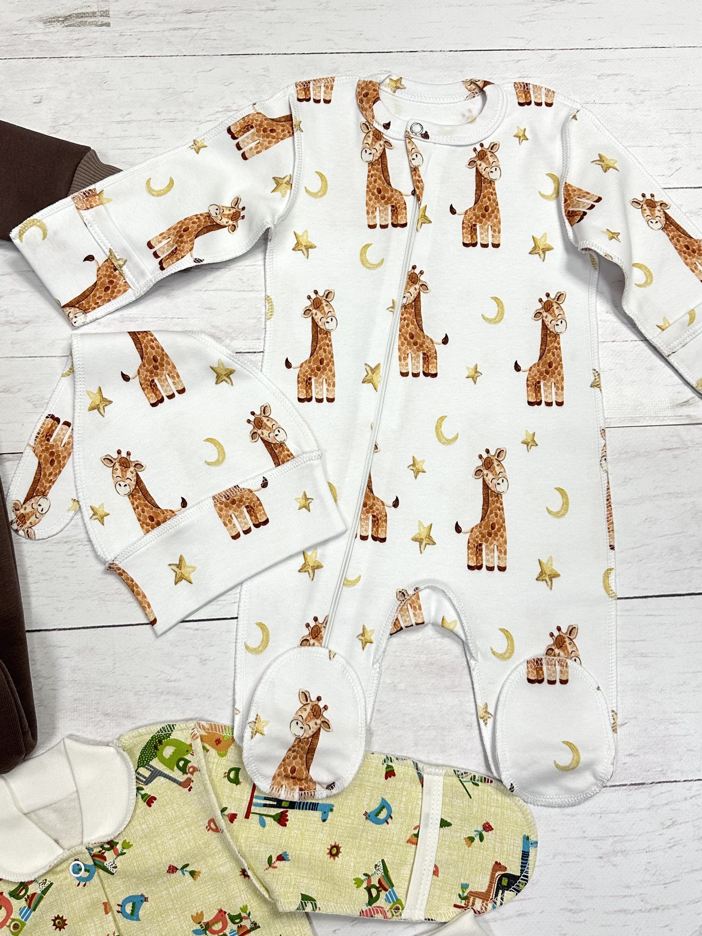 2. слип с шапкой, цвет белый с жирафами - интерлок, 100% хлопок;