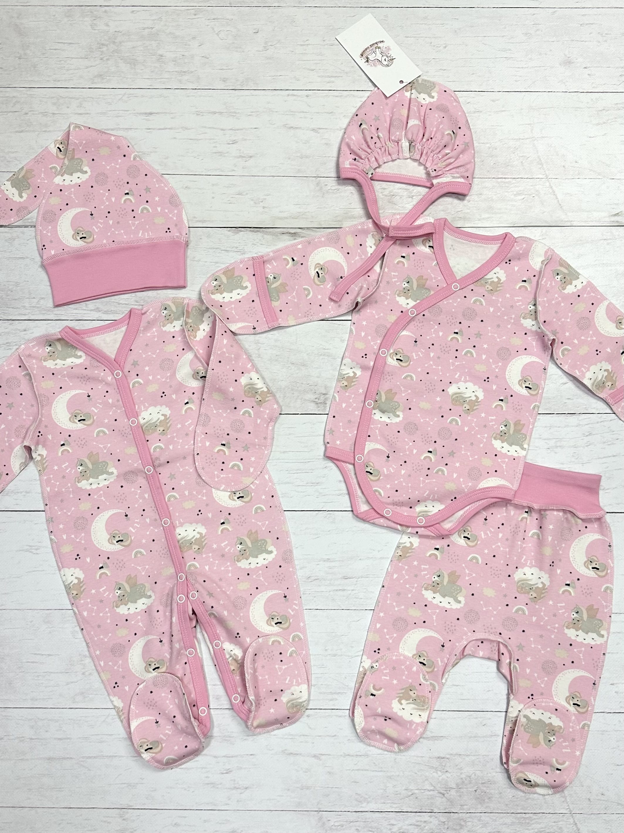 3. Комплект 5 пр. (слип, боди, ползунки, шапка, чепчик), цвет розовый с пони - интерлок, 100% хлопок.