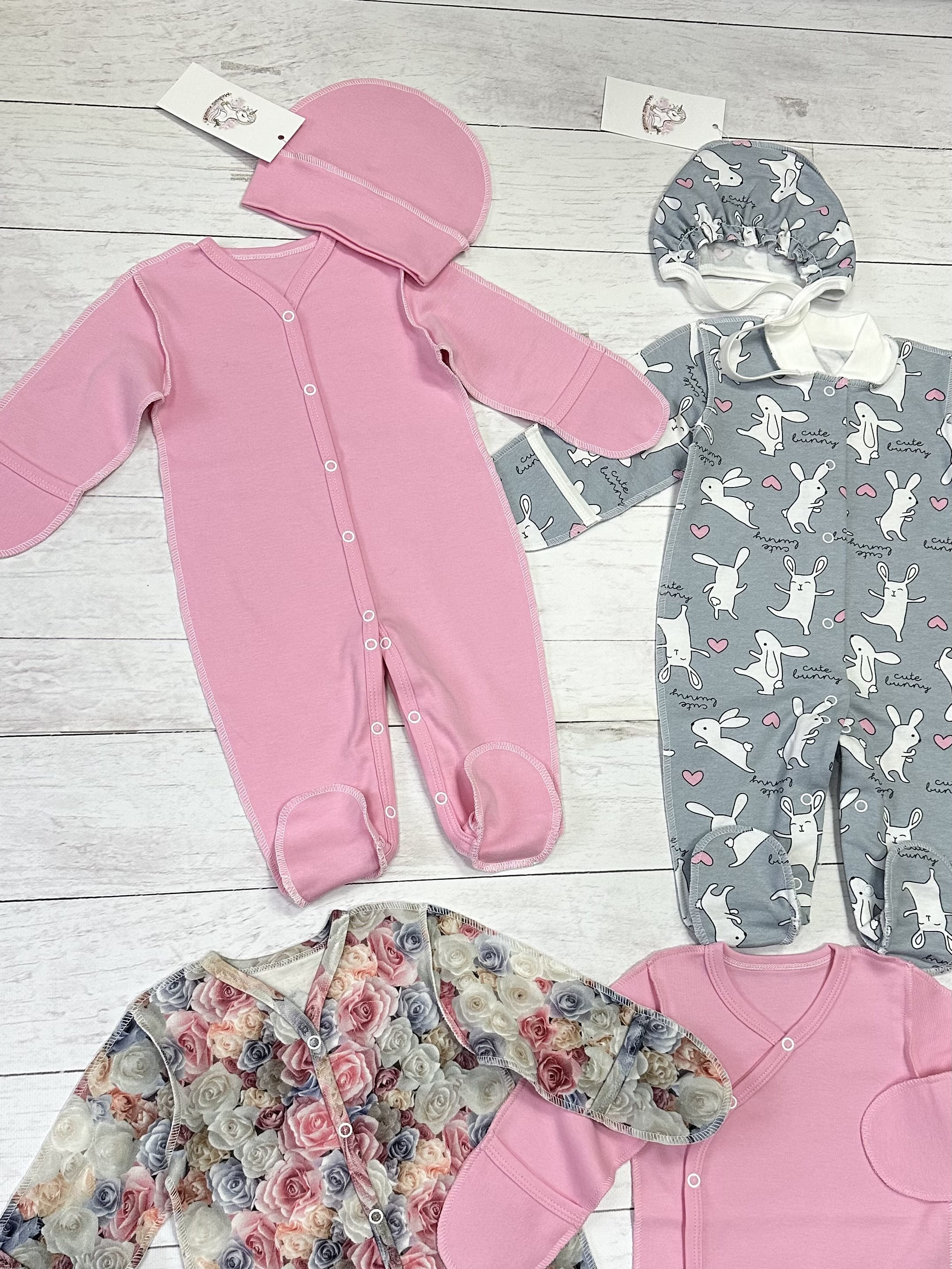 1. Комплект 5 пр. (слип, боди, ползунки, чепчик, шапка), цвет розовый с розами - интерлок, 100% хлопок.