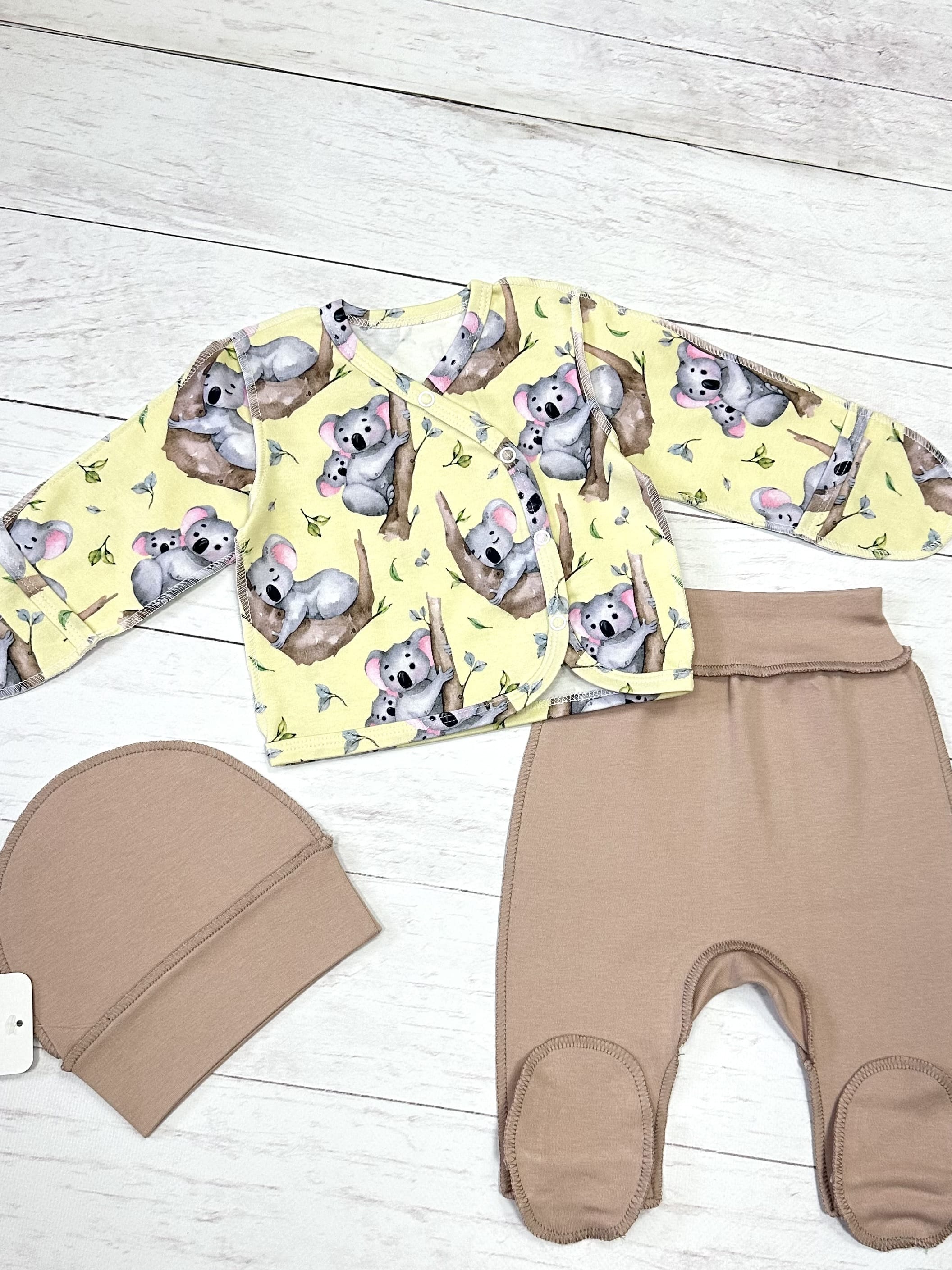 2. Комплект 3 пр. (кофточка, ползунки, шапка), цвет бежевый с рисунком - интерлок, 100% хлопок.