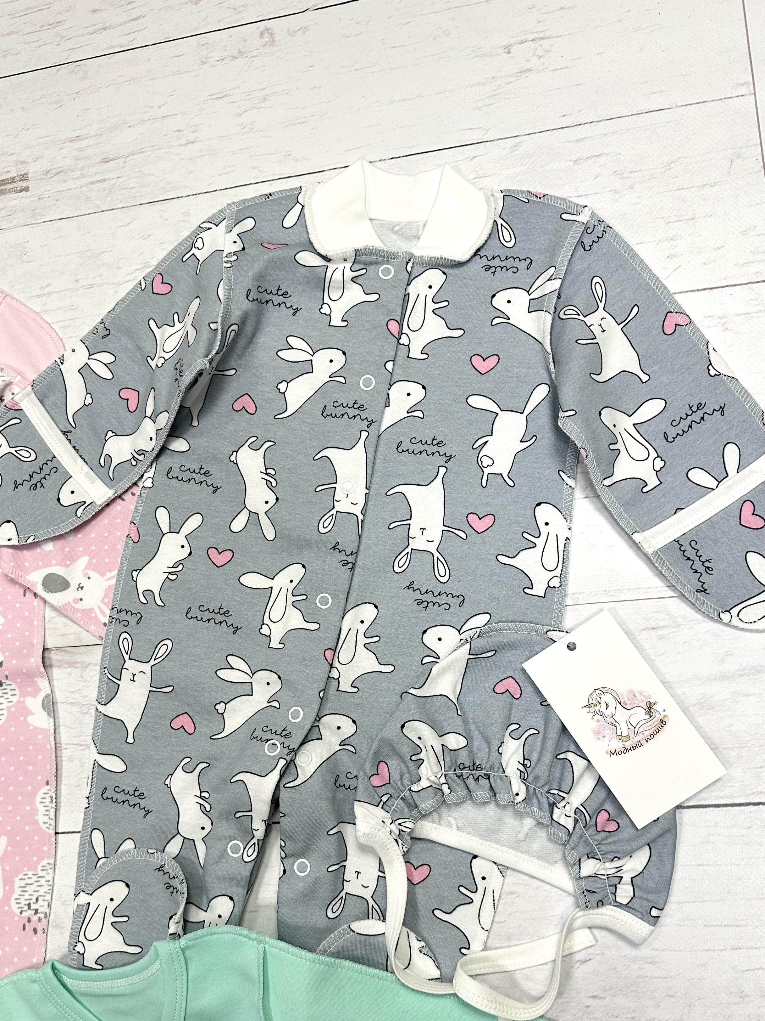 2. Слип с чепчиком, цвет серый с зайчиками - футер 2-х нитка начес, 100% хлопок.