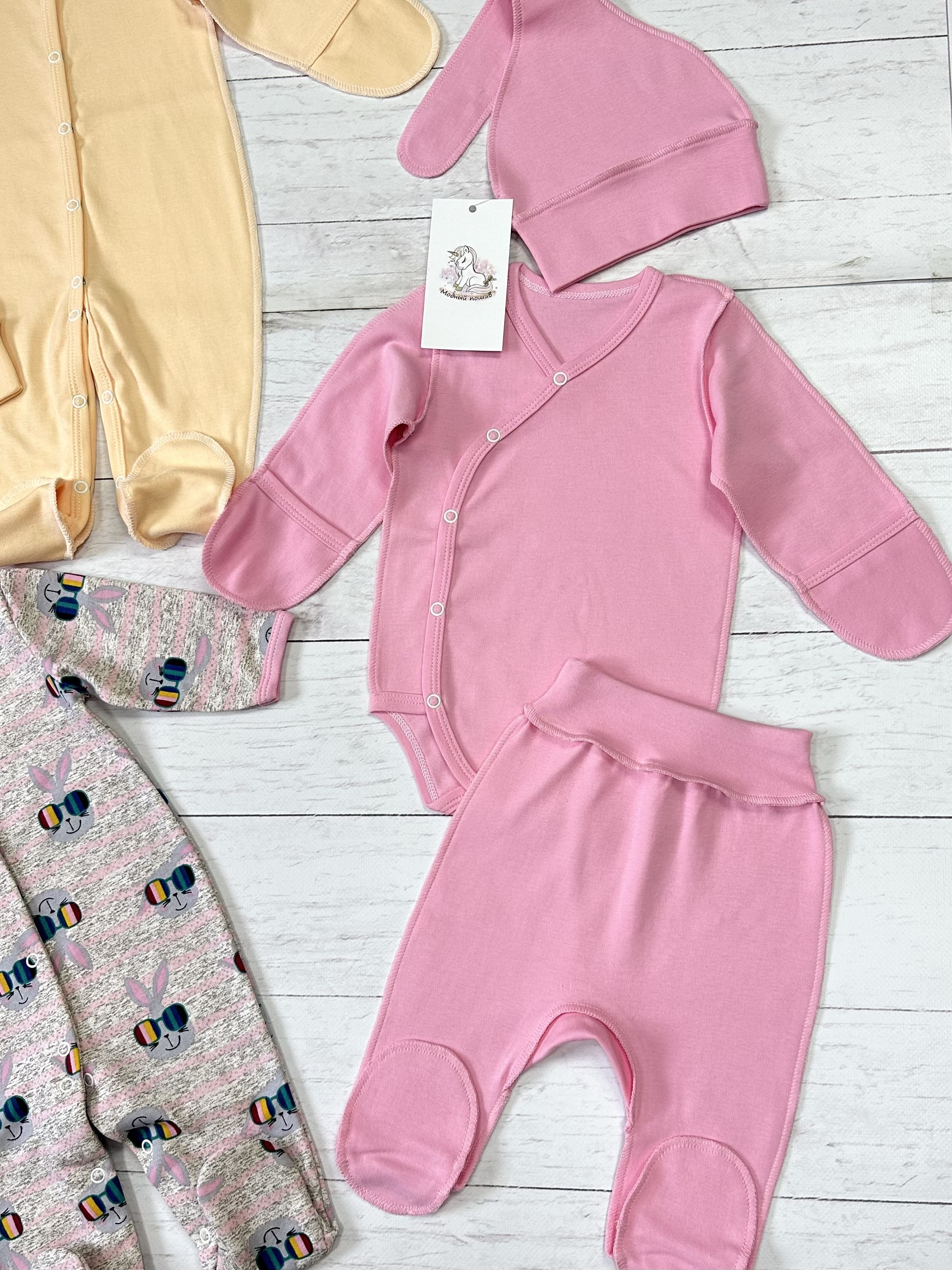 3. Комплект 3 пр. (боди, ползунки, шапка), цвет розовый - интерлок, 100% хлопок.
