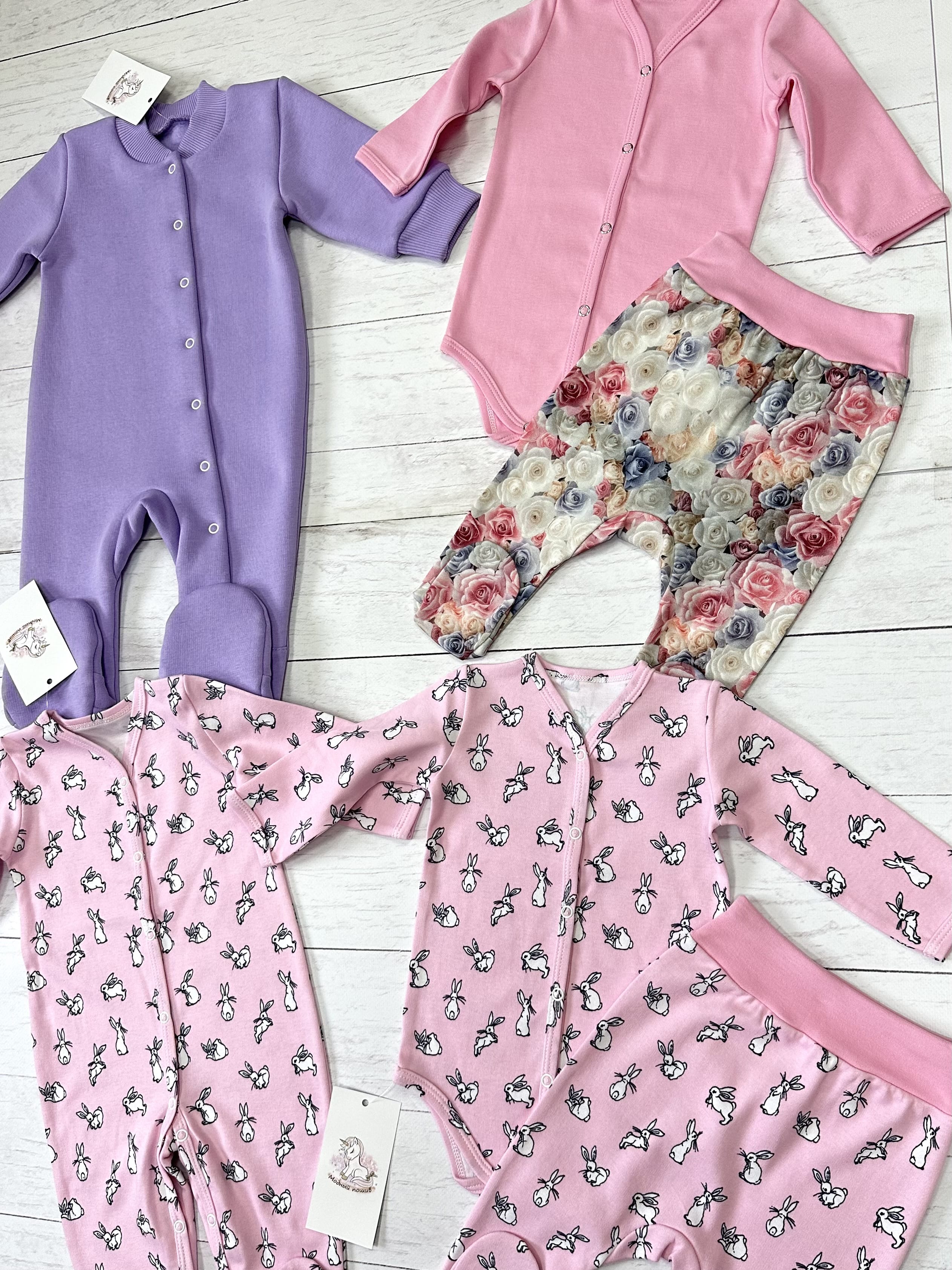 4. Комплект 2 пр. (боди, ползунки), цвет розовый с зайчиками - интерлок, 100% хлопок.
